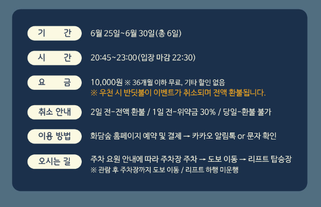 - 시간 : 20:45 ~ 23 : 00 ( 입장마감 22:30 )